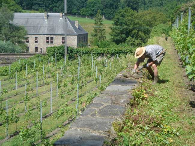 Un samedi matin par mois, parfois plus en pleine saison, ils se retrouvent là, sur ces quelques arpents de terre accrochés à l’abbaye de Villers-la-Ville. Entre vingt et trente bénévoles y travaillent, faisant revivre ce vignoble créé par les moines il y a plusieurs siècles. Il faut les voir à l’œuvre, autant d’hommes que de femmes, les uns qui binent la terre, d’autres qui taillent les arbustes ou rafistolent les murets des terrasses. Le site est exceptionnel et de là-haut, au sommet de l’escalier qui mène au dernier rang de vigne, on peut distinguer la muraille qui ceinture l’abbaye et la forêt qui l’entoure.
