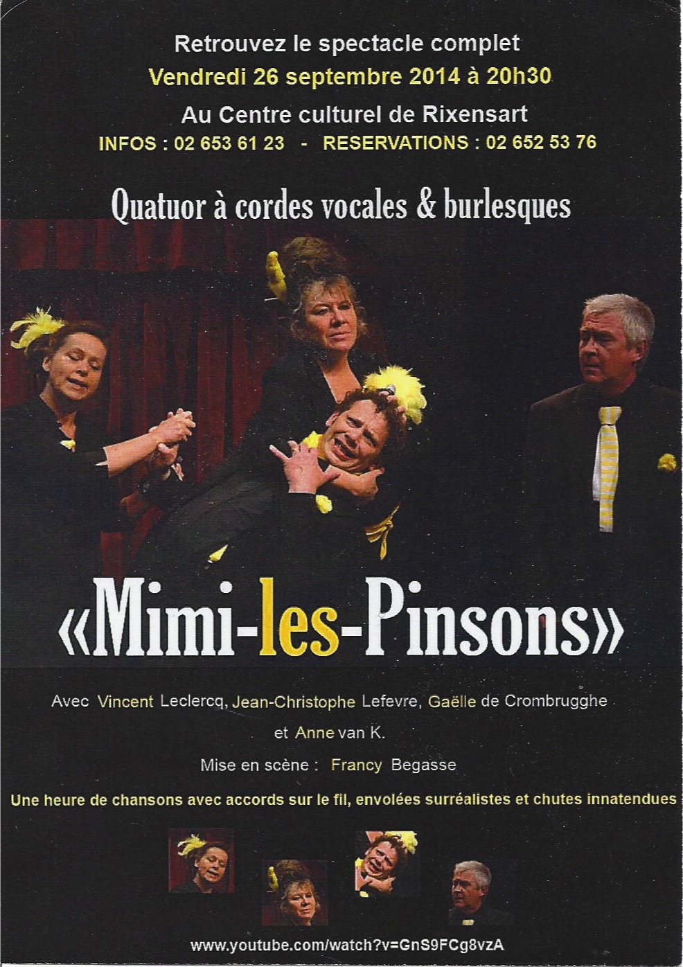 140824MimilesPinsons-1Notre voisin et ami Vincent Leclercq est une figure de proue du quartier. Locomotive dans l’organisation de la Fête des Combattants, il a donné de sa personne par des spectacles dans l’avenue ou encore présenté les musiciens qui défilaient sur la scène de la dernière Fête, au vignoble. On pourra se régaler en regardant son spectacle « Mimi-les-Pinsons » avec ses complices de la Compagnie du Tarmac au Centre culturel de Rixensart, sur la place communale de Genval, le vendredi 26 septembre à 20h30.