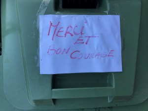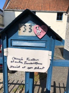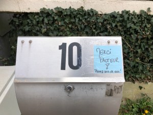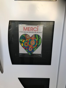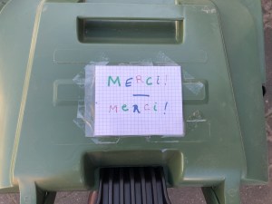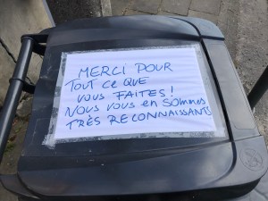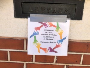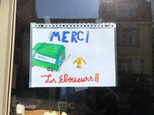 Alors que le confinement nous oblige à rester chez nous, des personnes continuent de travailler pour nous. De multiples messages de remerciement ont fleuri dans le quartier à l’adresse des facteurs, livreurs, éboueurs, personnel de la grande distribution ou des commerces de bouche, soignants, etc. Un petit florilège de ces mercis glanés dans l’avenue des Combattants à Genval.