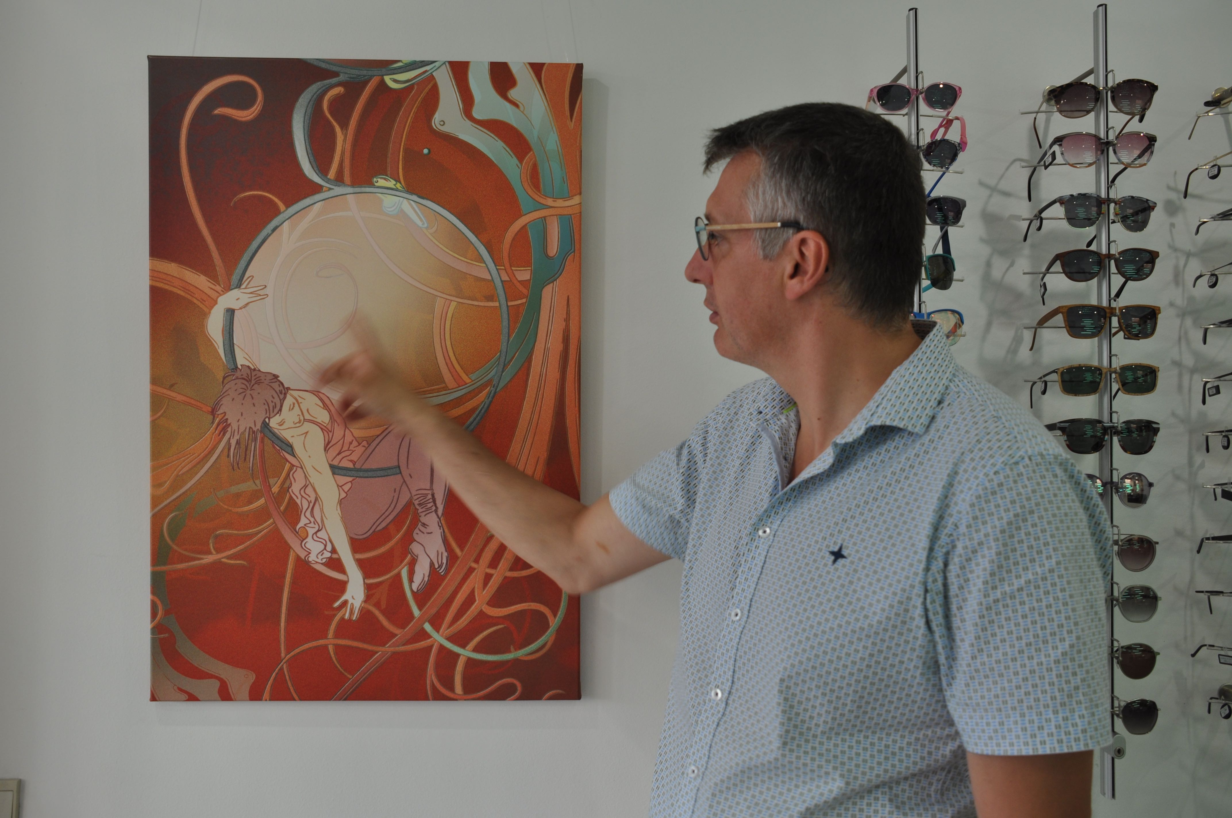 On ne peut pas louper les vitrines de FX Opticien, au bas de la rue de la Station, à un jet de lorgnon de la gare de Genval: on y voit souvent l’art côtoyer de belles montures. François-Xavier accueille régulièrement des œuvres d’artistes locaux. « Cela fait bon ménage avec les lunettes. Je suis heureux de contribuer ainsi à la vie locale », confie-t-il.