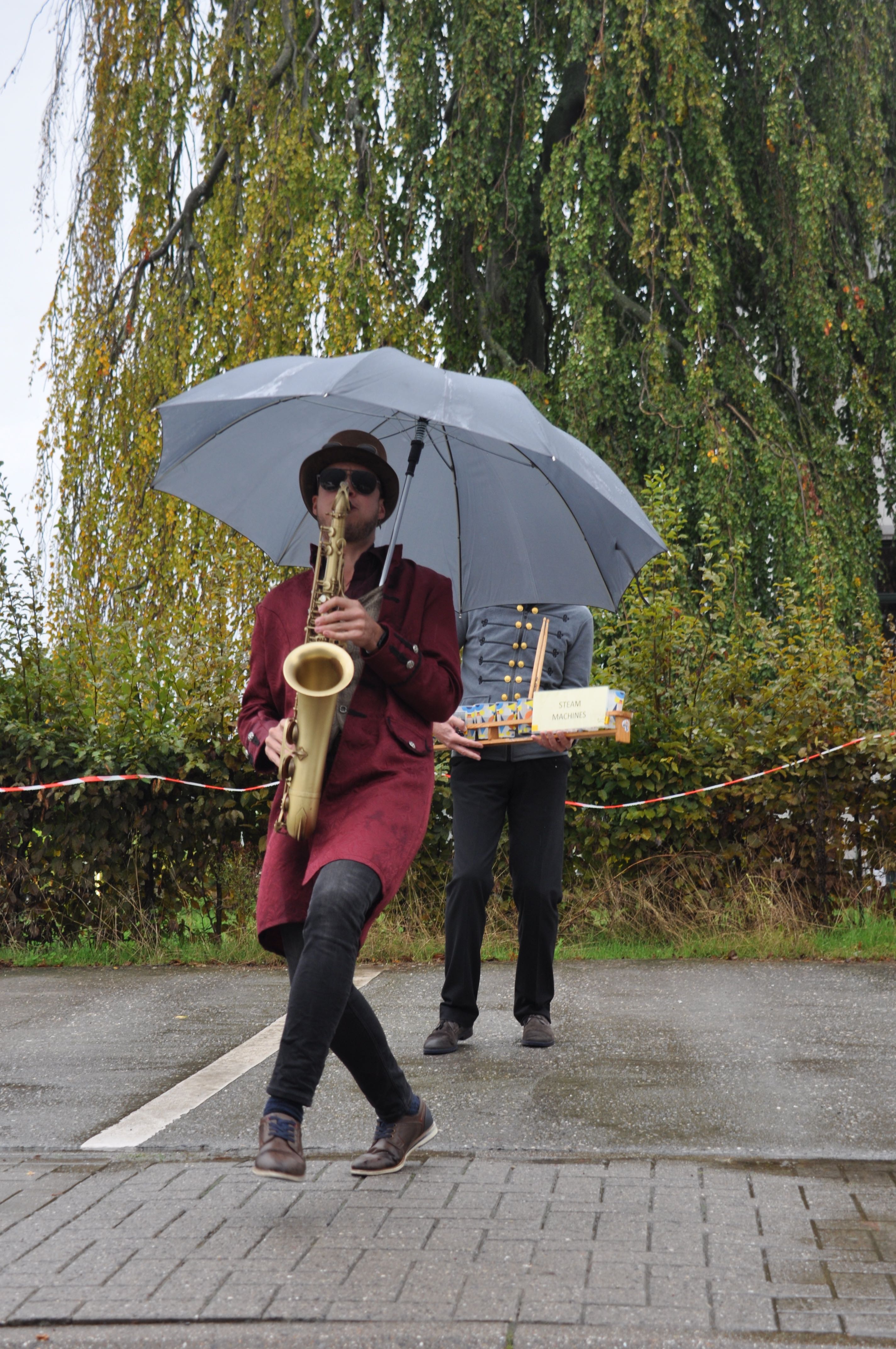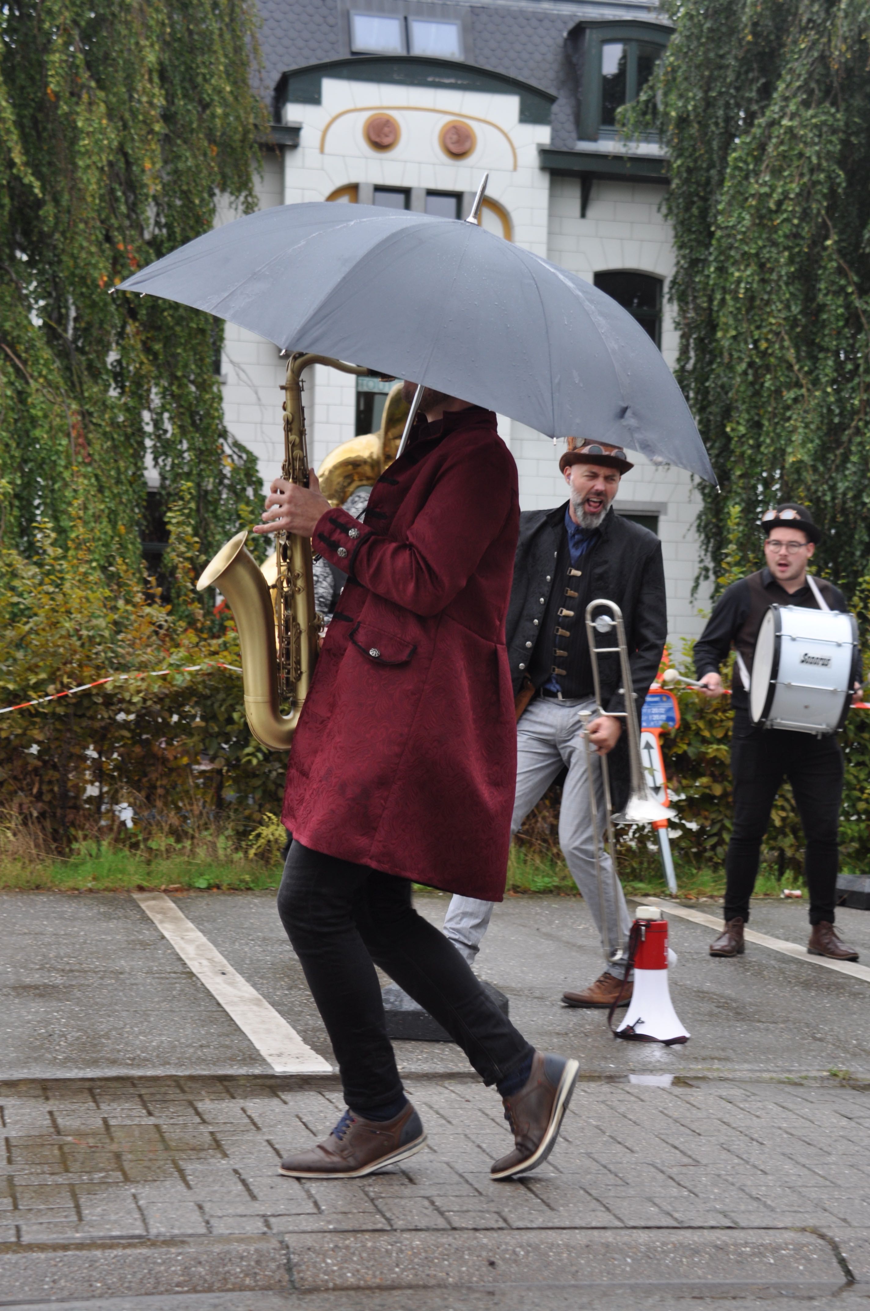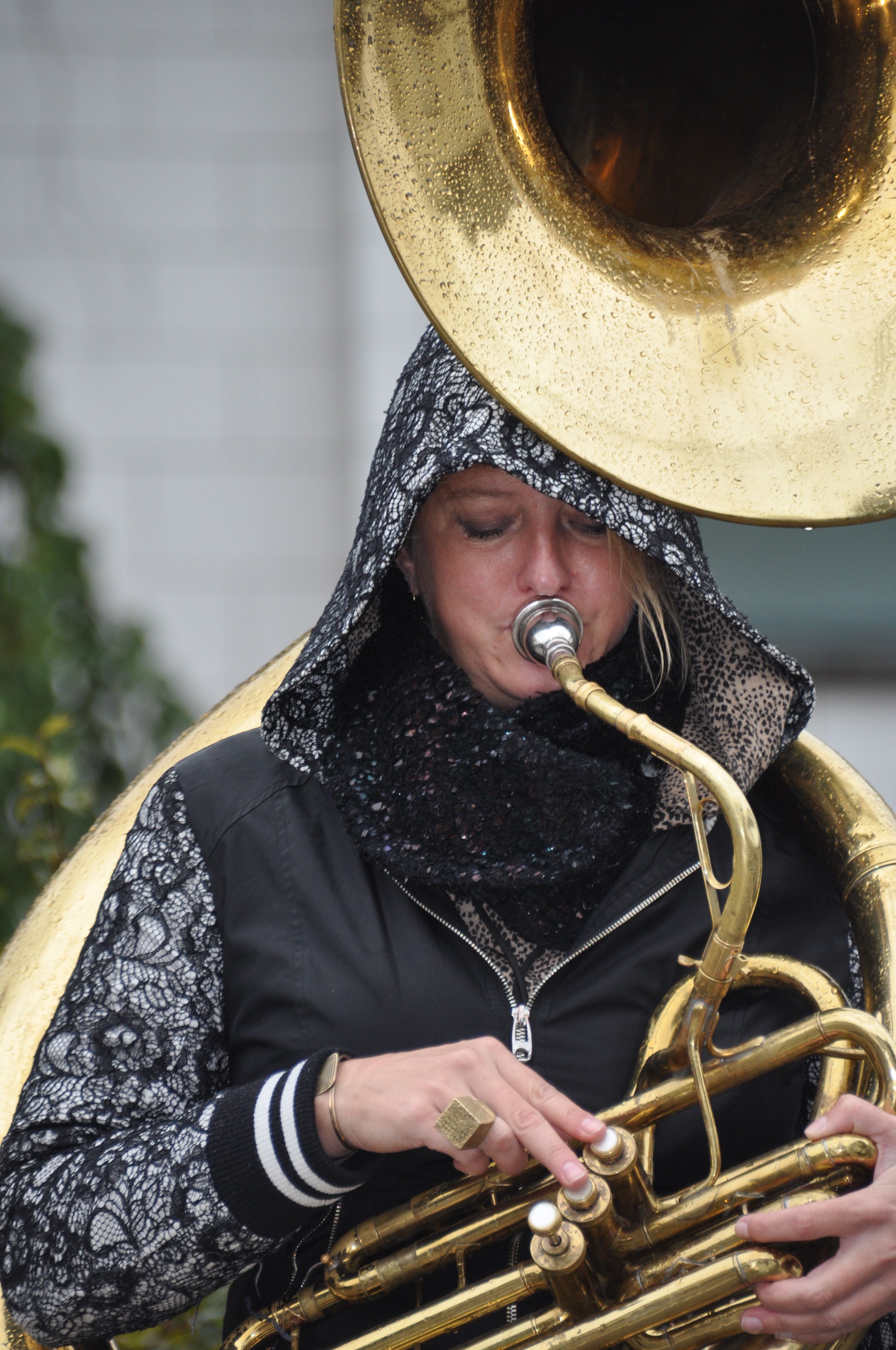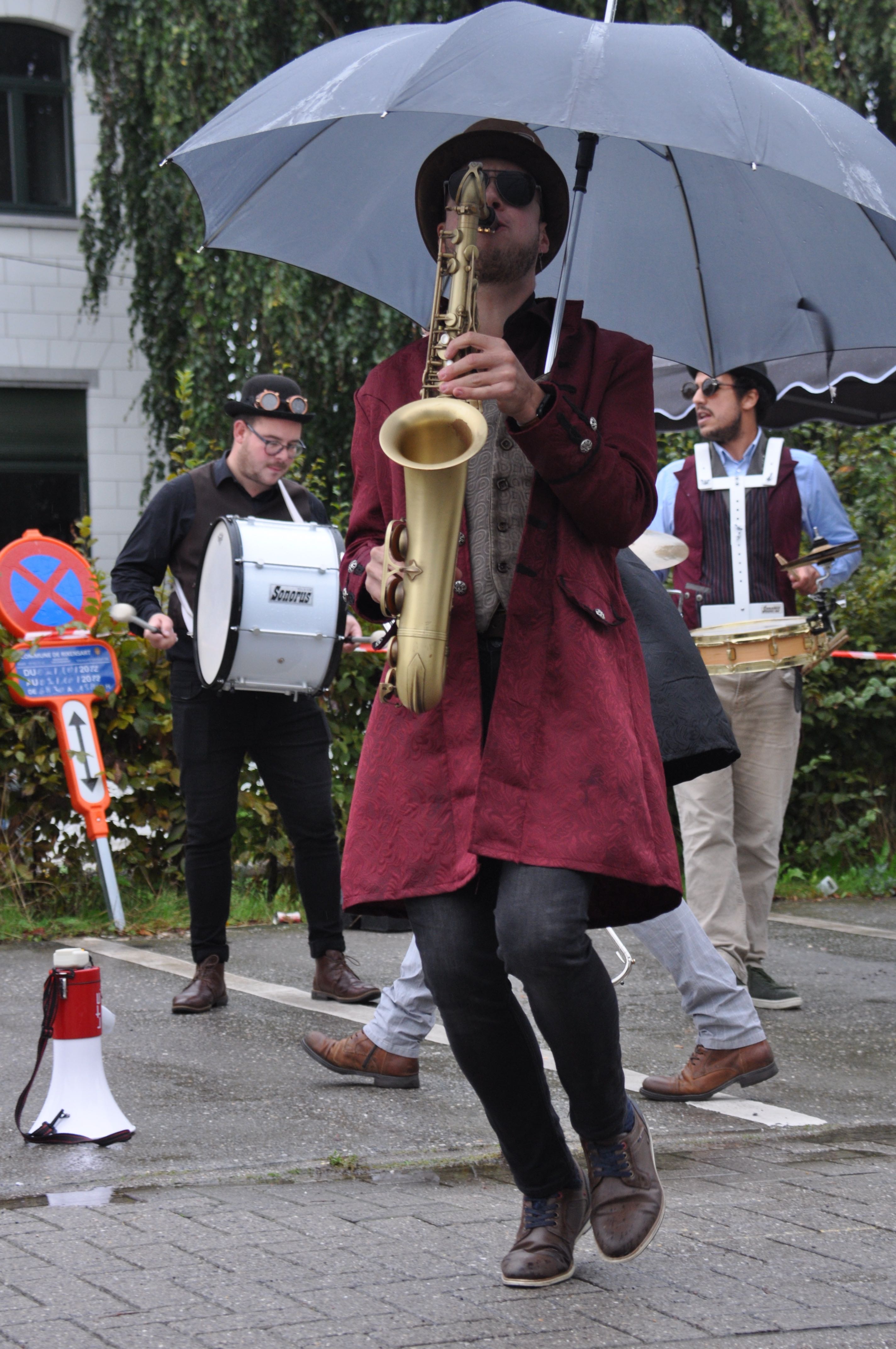 Heureusement, le soleil n’était pas si loin. En fin de matinée, la pluie s’est atténuée et Steam Machines, le premier brass band est parti vaillamment à l’assaut de l’avenue, un parapluie pour protéger le saxophone. La musique a réchauffé les corps et les coeurs: le public était ravi de voir les orchestres déambuler dans la rue.